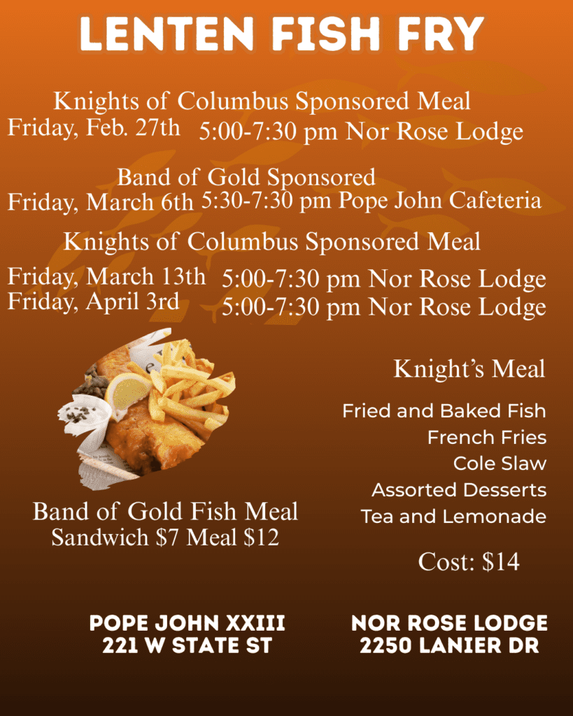 Fish Fry – 5:00-8:00 pm Sponsored by Band of Gold at St. Pope John XXIII Elementary Cafeteria